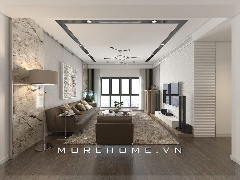 Phòng khách căn hộ chung cư đã được trang bị đầy đủ với bộ sofa hiện đại bọc da màu nâu cao cấp, cùng với thiết kế kiểu dáng văng gọn gàng, góp phần tạo nên sự thoáng đãng tiện lợi và sang trọng đẳng cấp.